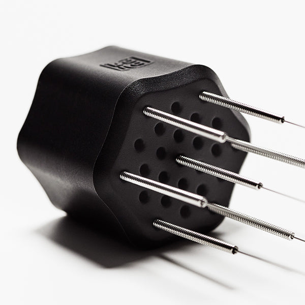 This innovative distribution tool has a silicone base with 25 strategic needle placements that you can experiment with. Unlike other WDTs, The Barista Hustle tool comes with special rounded needles that will keep your baskets scratch-free, plus your fingers will thank you later. The .35mm thick needles are also perfectly sized for distributing the grinds without creating deep trails.