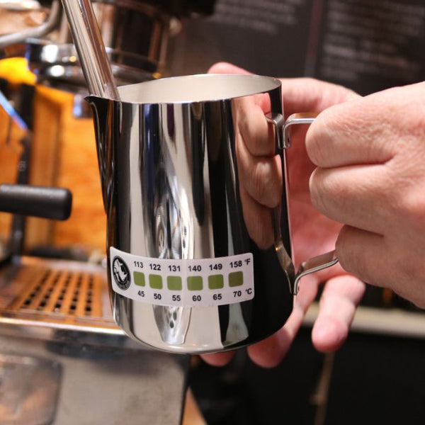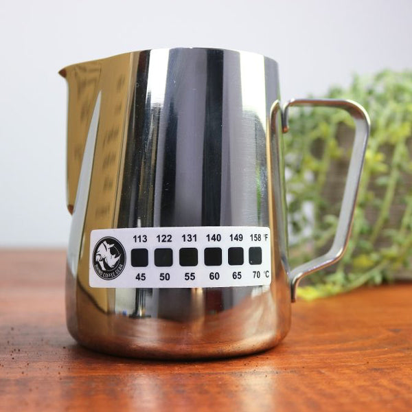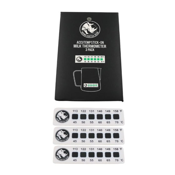 Get accurate milk steaming results every time with the Rhino Coffee Gear Accutemp Stick-On Thermometer, designed to attach directly to your frothing pitcher. The thin, stick-on strip gives immediate feedback as you steam, with colour-changing liquid crystals that shift from green to black as your target temperature is reached.